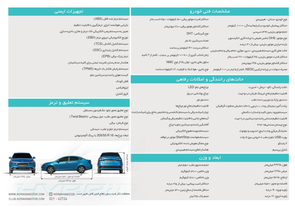 همچنین سدان هیبرید ملی کرمان موتور با این مشخصات فنی، 280 نیوتن متر گشتاور را تولید میکند.