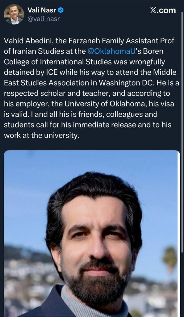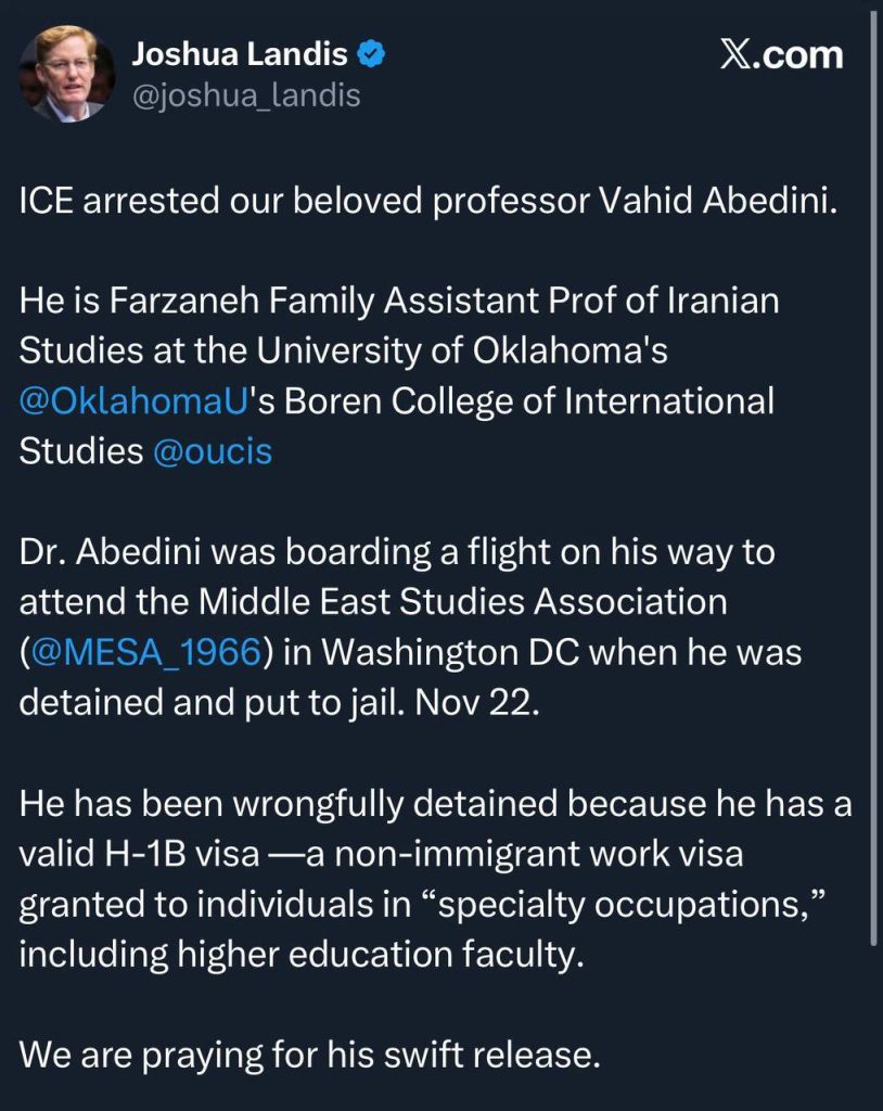همکار دکتر عابدینی، دکتر جاشوا لندیس در شبکهی ایکس نوشت: «سازمان مهاجرت و گمرک ایالات متحده (ICE) استاد عزیز ما، دکتر وحید عابدینی، را بازداشت کرده است. ایشان استادیار «خانواده فرزانه» در مطالعات ایرانی در دانشگاه اوکلاهاما و عضو هیئت علمی کالج بینالمللی بورِن در این دانشگاه هستند.